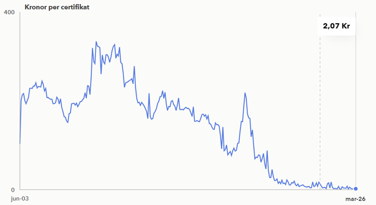 Som grafen nedan visar har ersättningen som elproducenterna fått via dessa certifikat minskat kraftigt sedan lanseringen 2003. Det innebär alltså att de delvis har spelat ut sin roll vilket beror på att målen redan är uppfyllda.